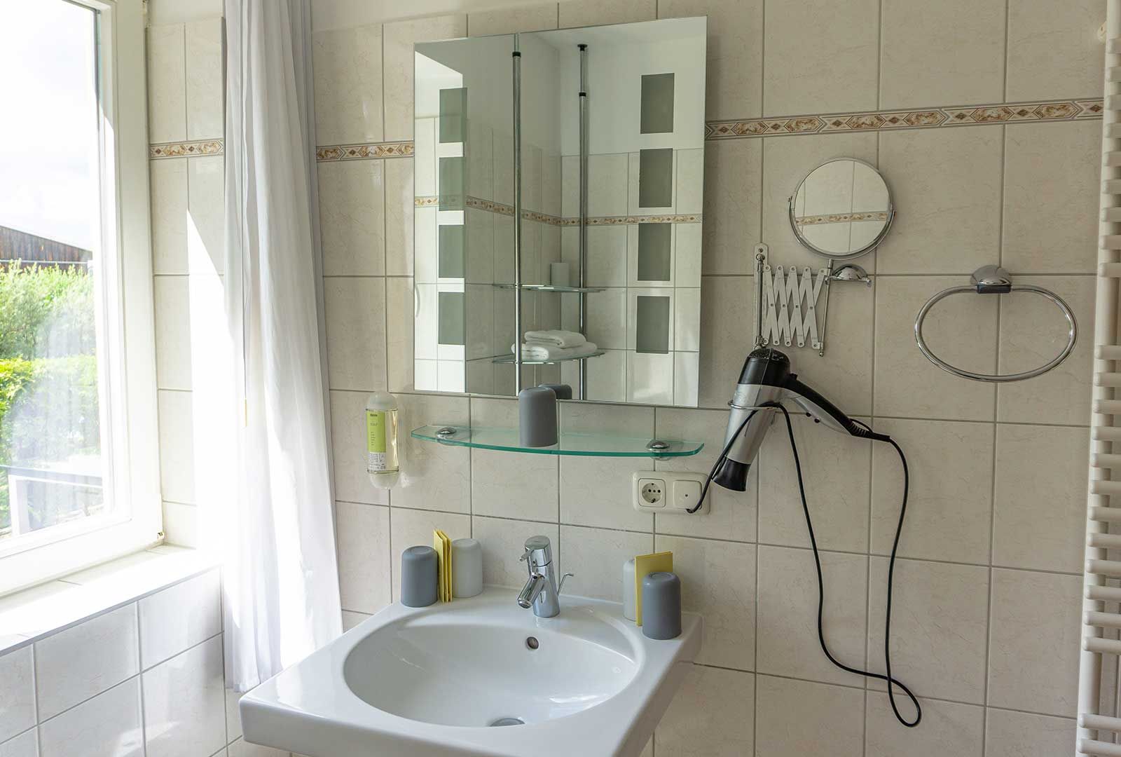Das Tageslicht-Bad befindet sich in der untersten Etage und ist mit einer geräumigen Dusche und einem wunderschönen Waschtisch mit einem schönen breiten Spiegel ausgestattet. Hier macht das Zähneputzen besonders viel Spaß, da man dabei einen schönen Ausblick auf den Grienericksee hat.
