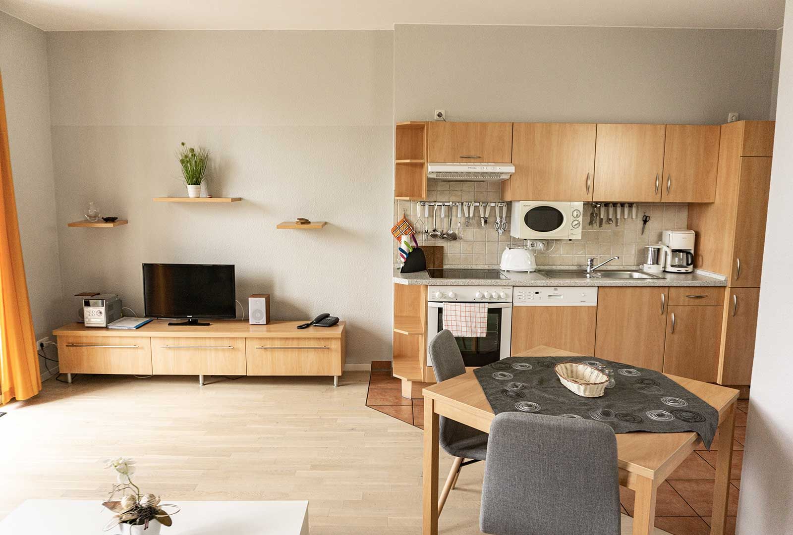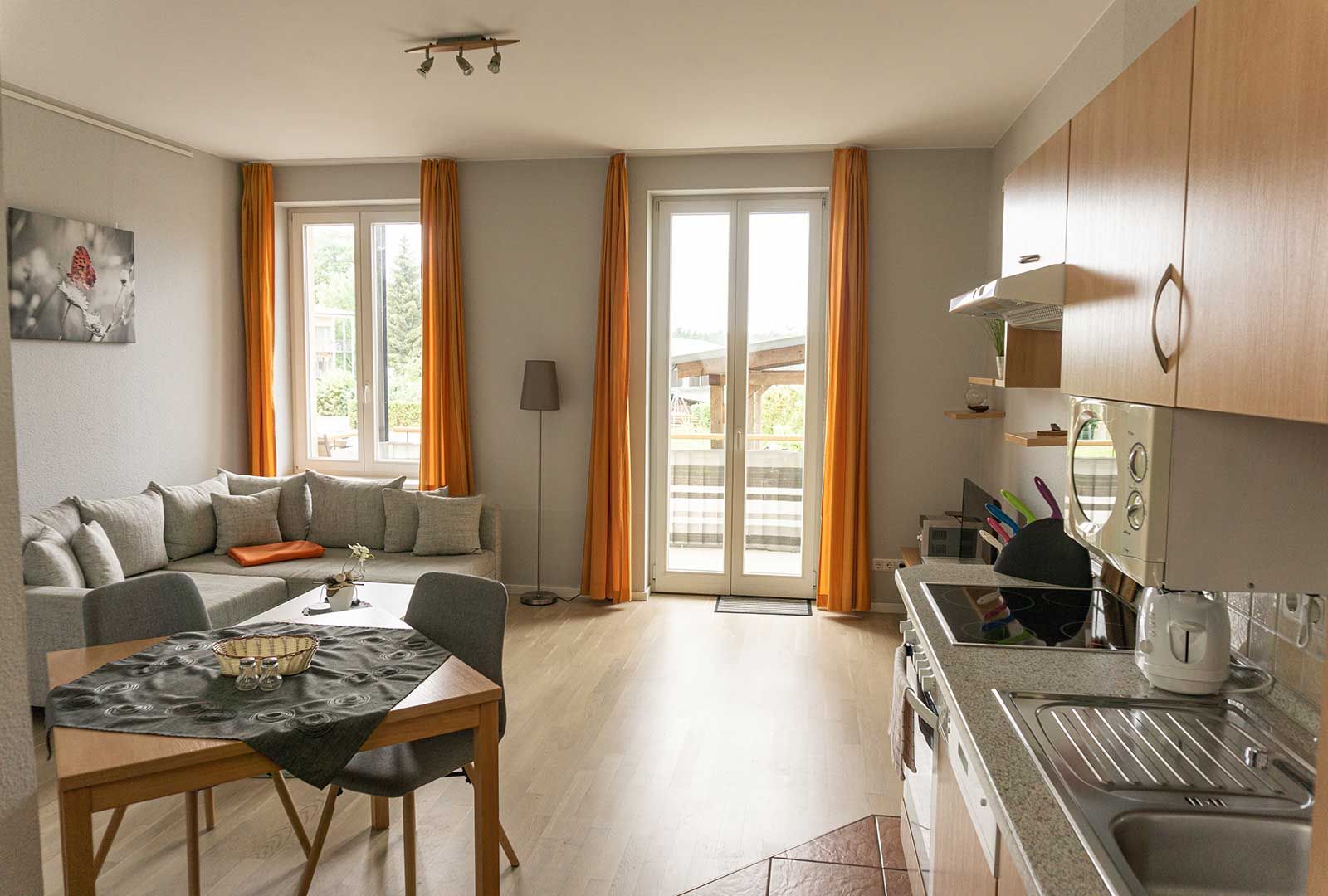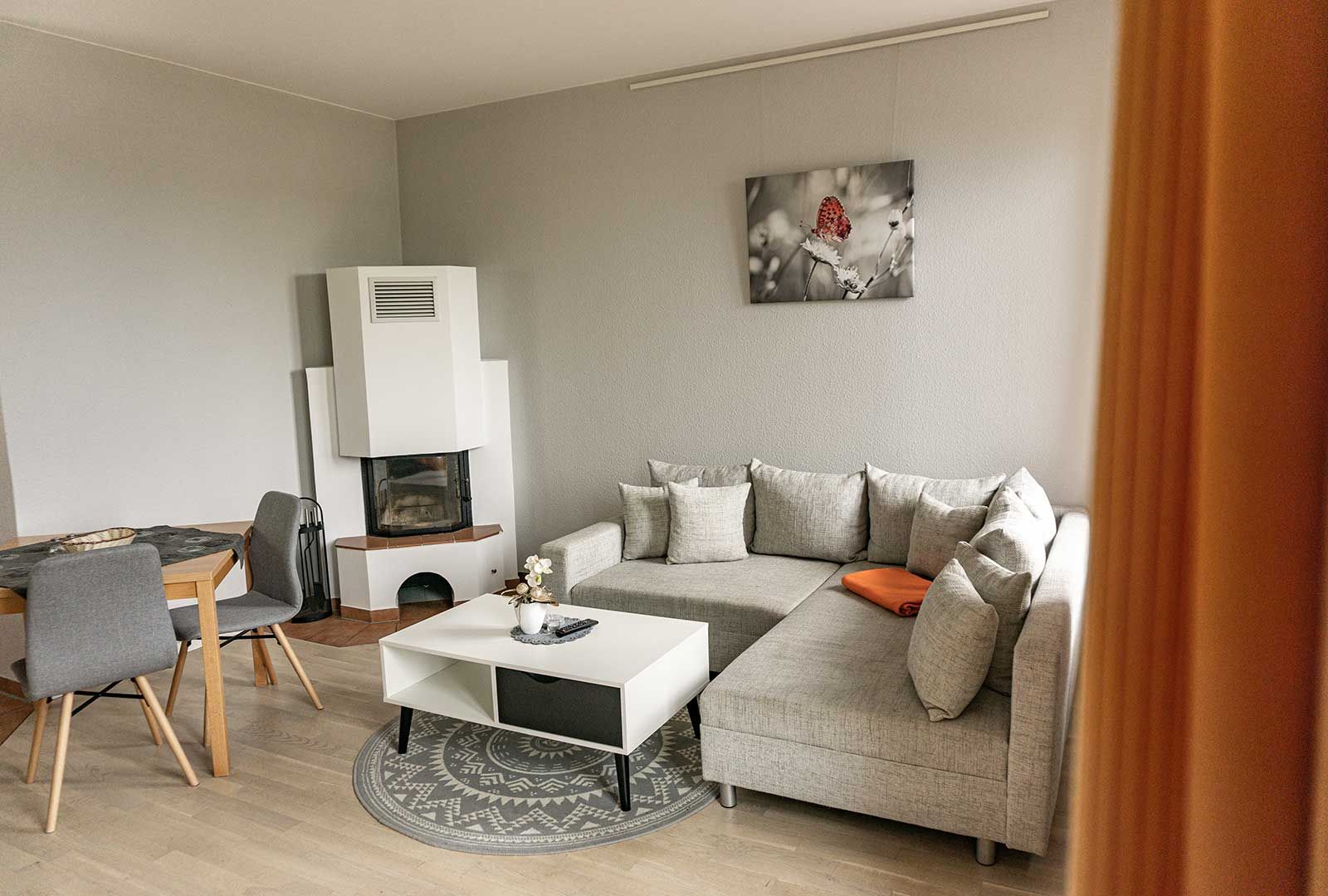 Die Apartments sind etwa 60 m² groß und eignen sich ideal für Paare oder Familien mit einem kleinen Kind. Vom großen Balkon mit imposanten Seeblick, nur einen Schritt entfernt, befindet sich der herrliche helle Wohnraum, der mit einem breiten Sofa, einem TV Flatscreen und einer Hifi-Anlage die Basics gepflegten Relaxens für Sie bereithält. Fließend geht dieser Bereich mit einem Esstisch und bequemen Stühlen in die Küche über, die modern und voll ausgestattet ist. Ein gemütliches Schlafzimmer mit Doppelbett setzt den bereits im Wohnbereich kennengelernten Stil fort. Im Tageslicht-Bad befindet sich eine geräumige Dusche, ein großer Waschtisch mit einem schönen breiten Spiegel. Ein besonderes Highlight ist natürlich der Kamin, der gerade in der Übergangszeit im Frühjahr und Herbst sowie im Winter für eine kuschlige Atmosphäre sorgt.