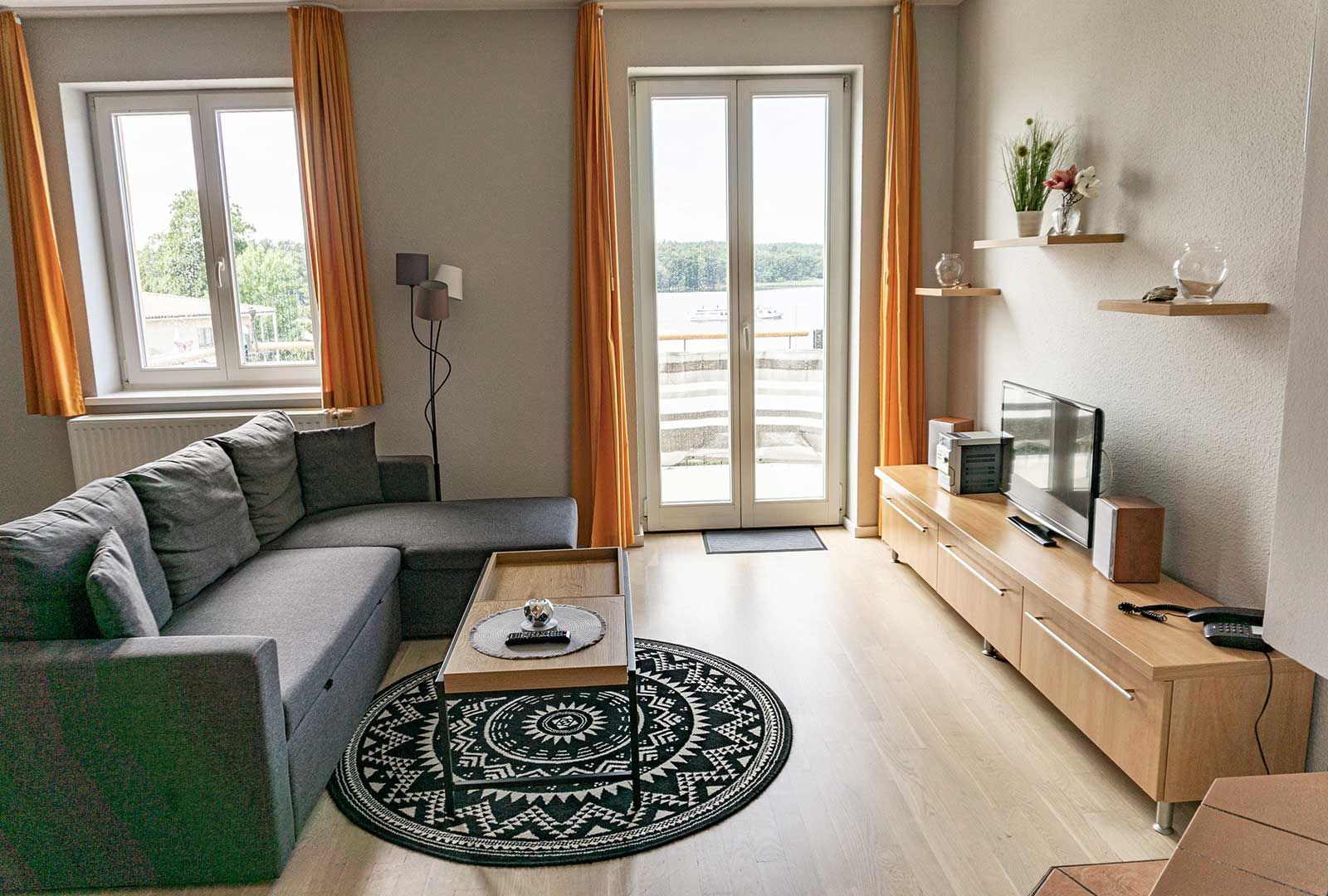Die 3 Apartments sind etwa 75 m² groß und eignen sich ideal für Paare oder Familien mit Kindern. Von dem Balkon, der einen unbeschreiblichen imposanten Seeblick bietet, ist der großzügige helle Wohnraum nur einen Schritt entfernt. Er ist mit einem breiten modernen Sofa, einem TV Flatscreen und einer Hifi-Anlage - die Basics gepflegten Relaxens - ausgestattet. Fließend angrenzent geht dieser Breich mit einem großen Esstisch und bequemen Stühlen in die Küche über, die modern und voll ausgestattet ist. Der Kamin, der dem großen Wohnraum eine ganz besondere charmant-romantische Note verleiht, bildet das Zentrum des Apartments.